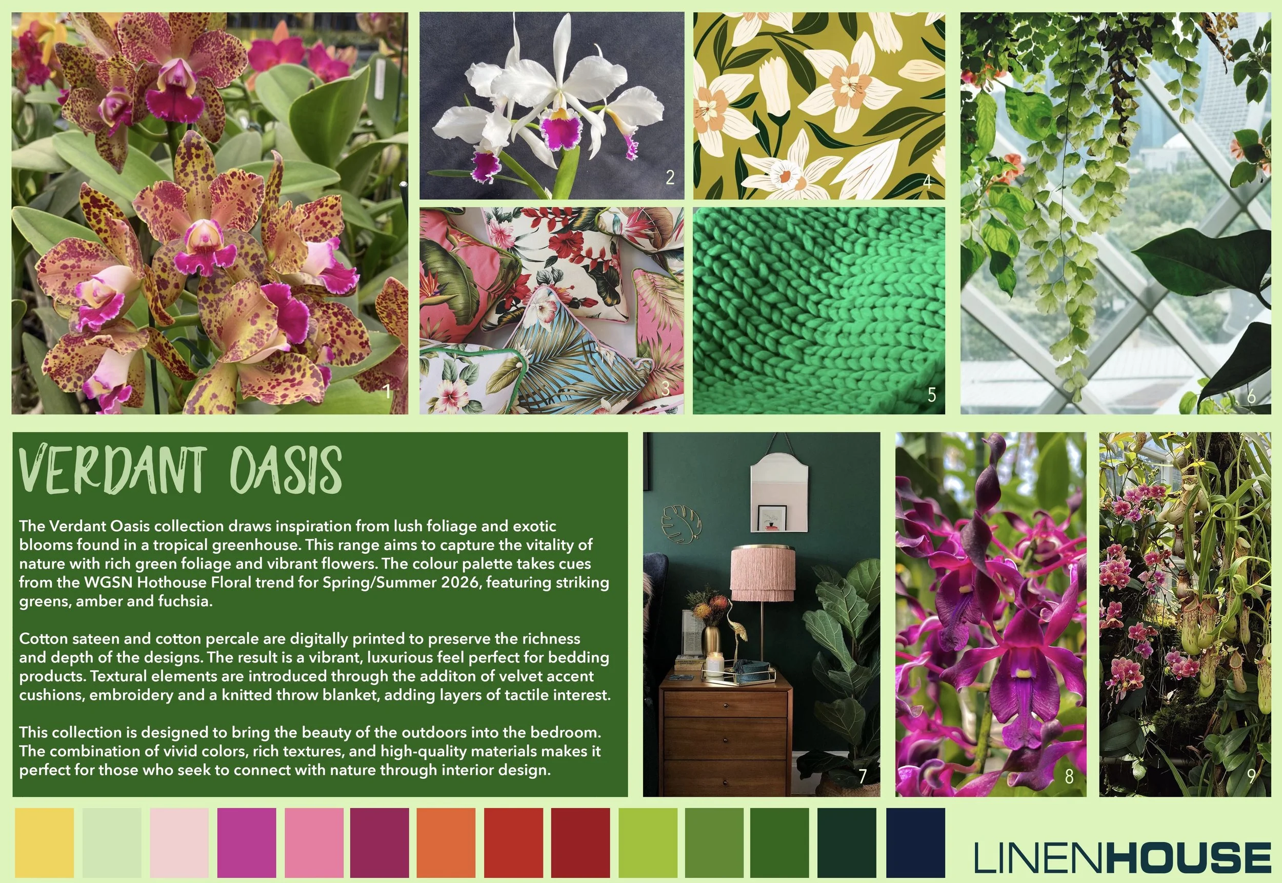 Verdant Oasis is a vibrant bedding collection inspired by the lush beauty of greenhouses and inspired by the Hothouse Florals trend forecasted by WGSN. The design celebrates the energy and diversity of tropical plant life, featuring orchids, bromeliads and other exotic foliage in a layered composition meant to evoke an immersive indoor jungle.
